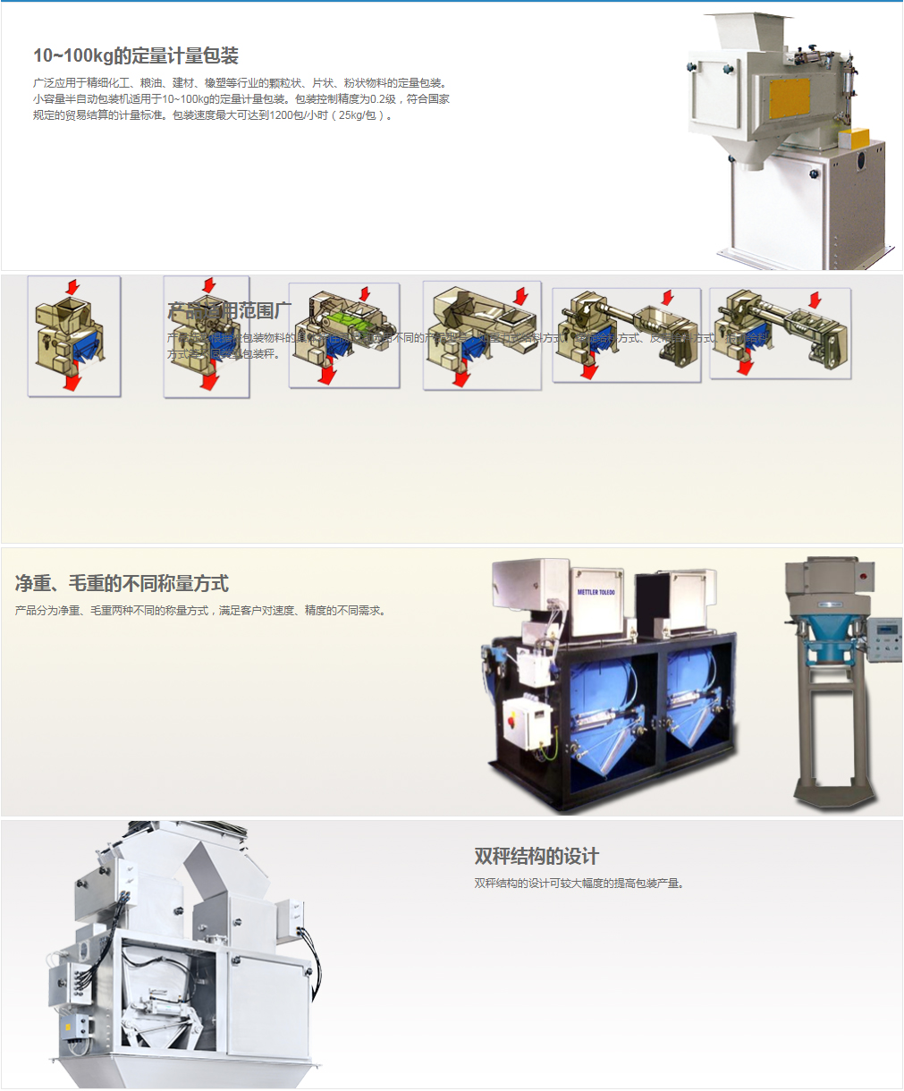 廣泛應(yīng)用于精細(xì)化工、糧油、建材、橡塑等行業(yè)的顆粒狀、片狀、粉狀物料的定量包裝。小容量半自動包裝機(jī)適用于10~100kg的定量計量包裝。包裝控制精度為0.2級,符合國家規(guī)定的貿(mào)易結(jié)算的計量標(biāo)準(zhǔn)。包裝速度最大可達(dá)到1200包/小時(25kg/包)。